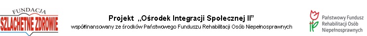 Fundacja Szlachetne Zdrowie od dnia 01-04-2023 r. rozpoczęła realizację Projektu pn. "Ośrodek Integracji Społecznej II" współfinansowanego ze środków Państwowego Funduszu Rehabilitacji Osób Niepełnosprawnych, którego celem zwiększenie samodzielności i niezależności osób niepełnosprawnych poprzez wsparcie ich rozwoju społecznego i zawodowego oraz umożliwienie im aktywnego funkcjonowania w społeczeństwie.