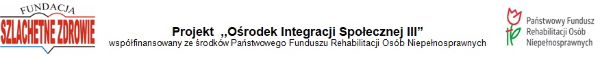 Fundacja Szlachetne Zdrowie od dnia 01-04-2024 r. rozpoczęła realizację Projektu pn. "Ośrodek Integracji Społecznej III" współfinansowanego ze środków Państwowego Funduszu Rehabilitacji Osób Niepełnosprawnych, którego celem jest zwiększenie samodzielności i niezależności osób niepełnosprawnych poprzez wsparcie ich rozwoju społecznego i zawodowego oraz umożliwienie im aktywnego funkcjonowania w społeczeństwie.