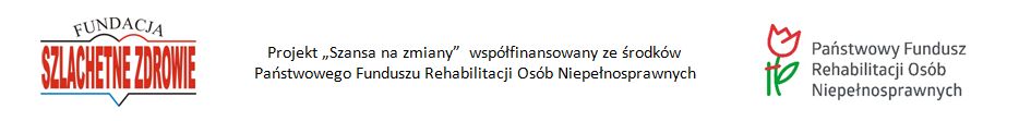 Fundacja Szlachetne Zdrowie od dnia 01-04-2024 r. rozpoczęła realizację Projektu pn. "Szansa na zmiany", współfinansowanego ze środków Państwowego Funduszu Rehabilitacji Osób Niepełnosprawnych, w ramach konkursu nr 1/2023 pn. „Możemy więcej” z dnia 12-10-2023 r. - Zwiększenie Samodzielności Osób Niepełnosprawnych, którego celem jest wejście na rynek pracy co najmniej 8 osób spośród 20 uczestników projektu.
